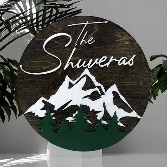 Personalized 3D Family name wood sign with mountains and trees- Dark round and dark green trees