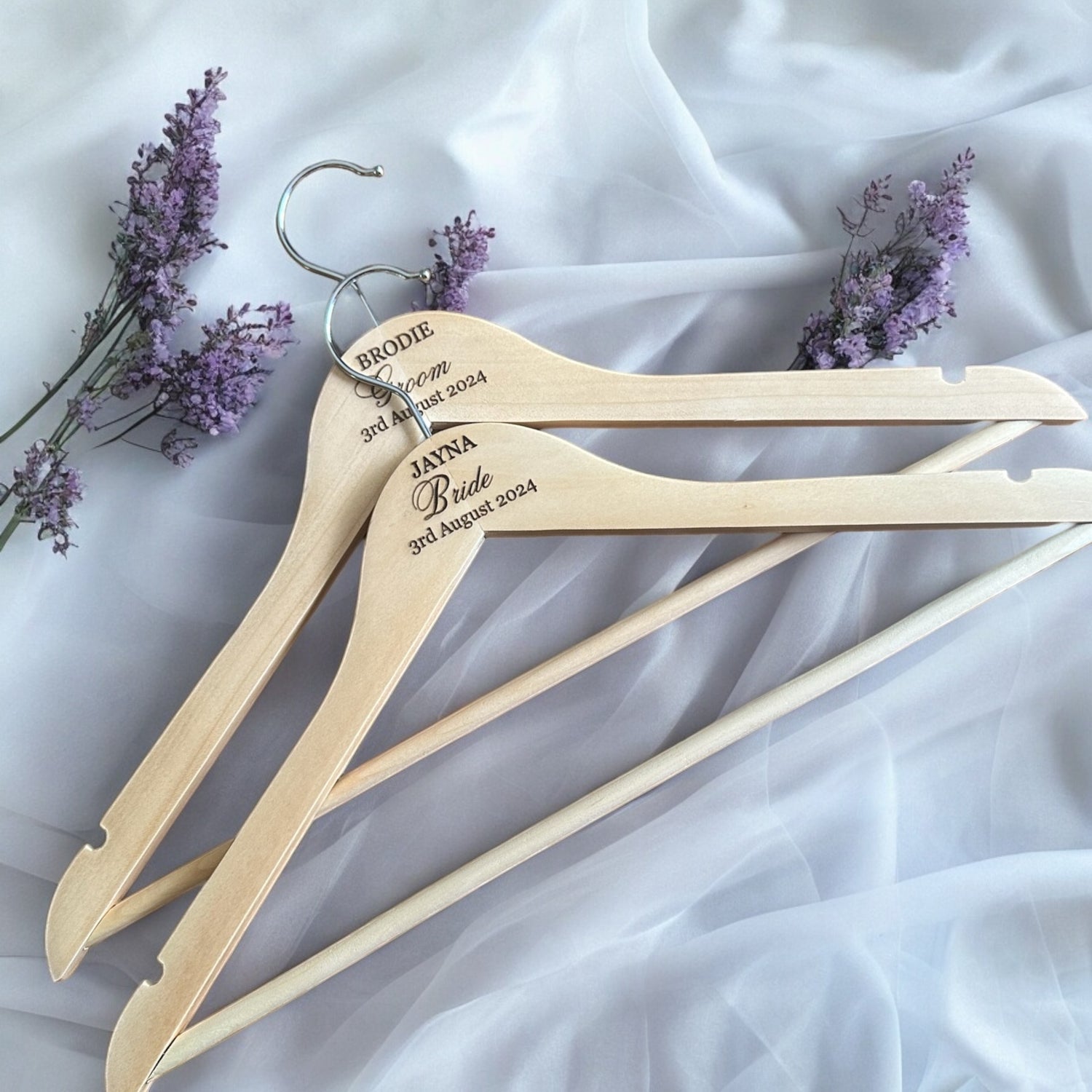 Discover personalized elegance with our custom engraved hangers featuring the bride's team...