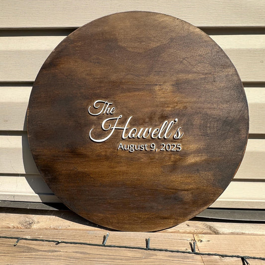 Personalized 3D Family name round wood sign with wreath