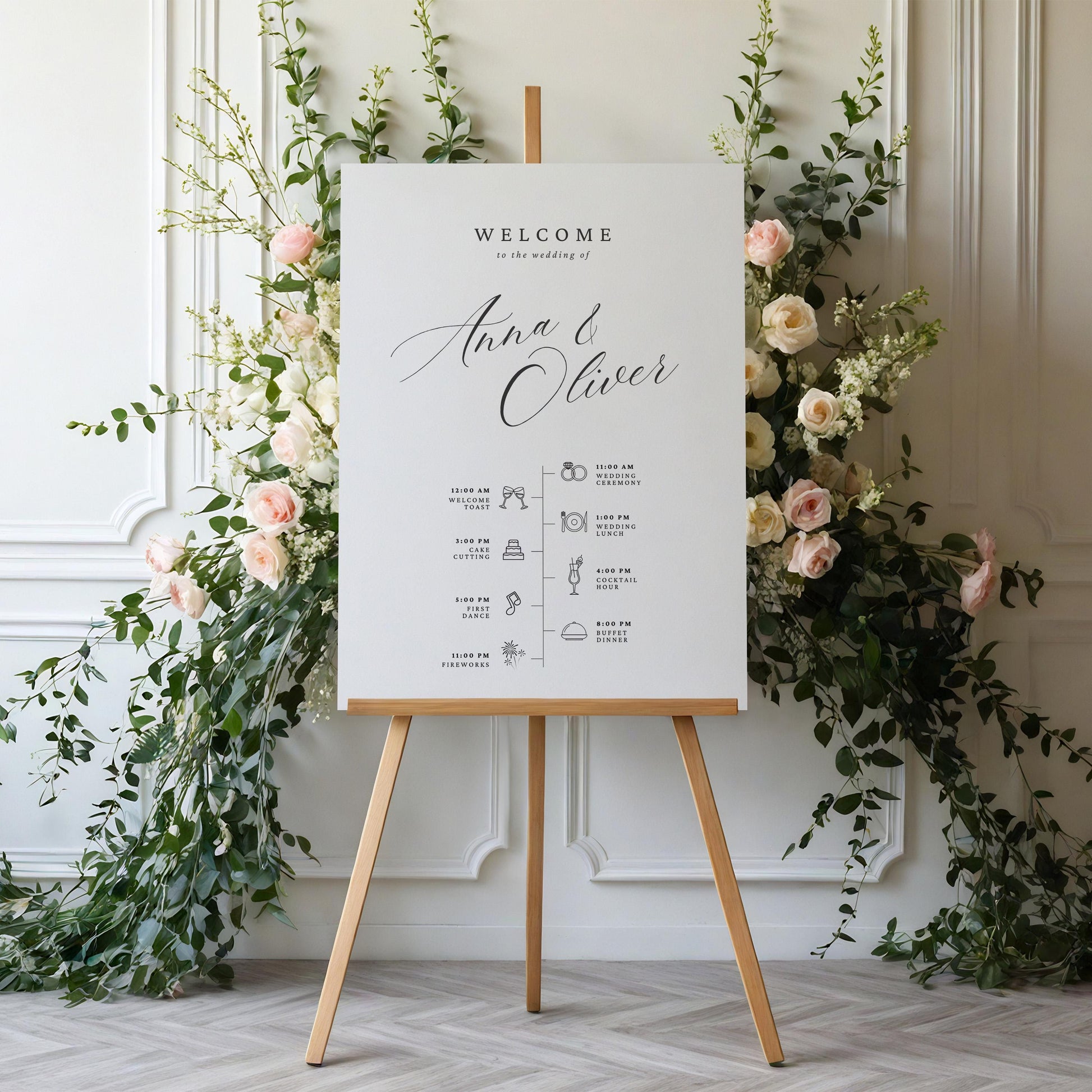 Welcome your guests in style with this elegant printed wedding timeline sign! Featuring your names and a clear schedule of the day’s events, this foam board sign adds a sophisticated touch to your ceremony or reception entrance. Designed with minimalist icons and graceful typography, it’s both decorative and informative—perfect for outdoor garden weddings, barn venues, or modern spaces.