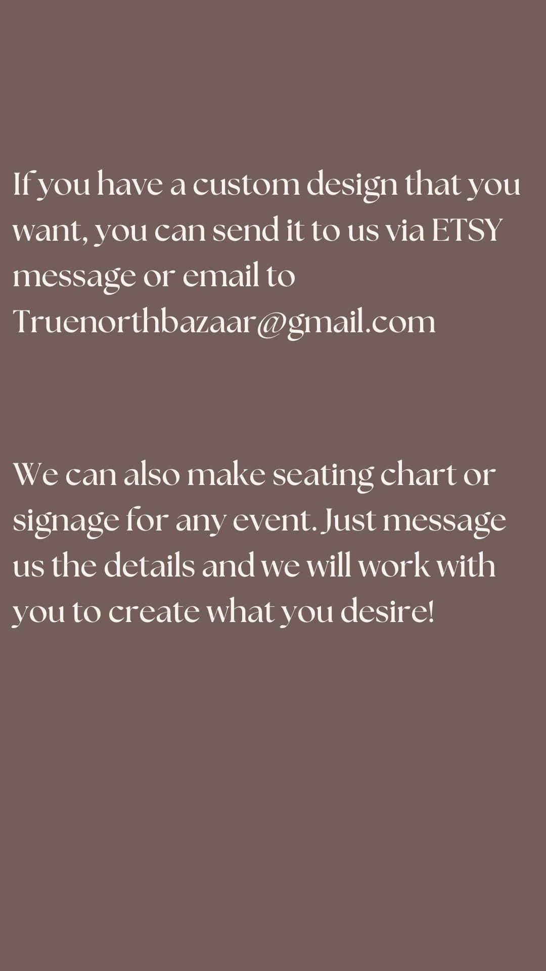 You can either choose one of the designs from photo or provide your own Design(Just send it to us via ETSY message or email at Truenorthbazaar@gmail.com)