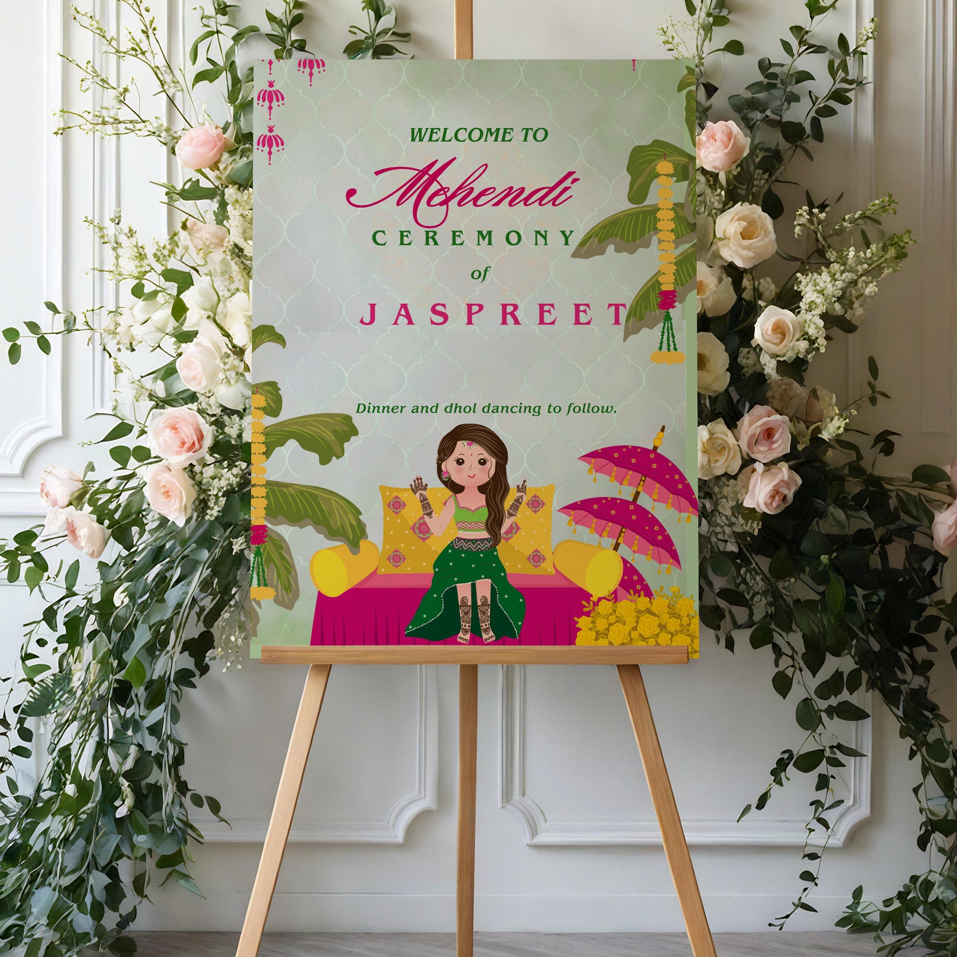 This sign will be perfect to Welcome your guests on your Mehndi/Henna day, Jaggo day, Sangeet day or Shaadi/Nikkah. Just write in Personalization box what event do you need it for and we will add that on your sign.